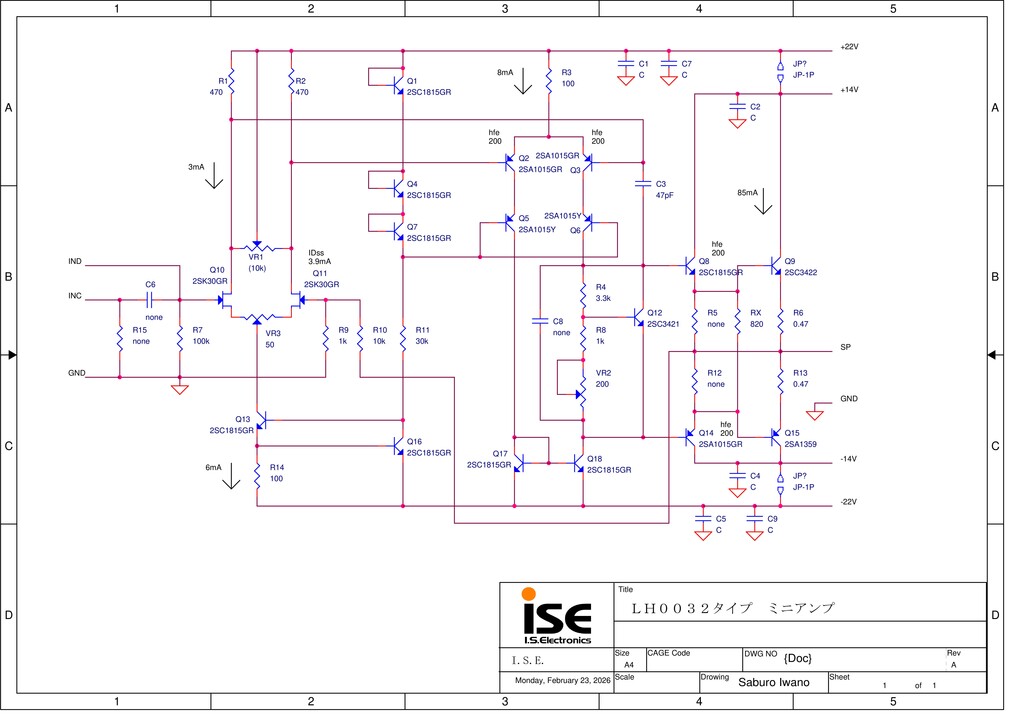 回路はできるだけ簡単にしました、何も足さない 何も引かない(笑)回路はまねてもパーツはまねられない(泣く)二段目差動TRコレクター(5mA)から終段TR(hFE100)ベースへダイレクト アイドリング電流0.5A hFEは温度によって変化するのでアイドリング暴走対策は放熱板に接着したC1815X2から一段目差動の電流を制限することで行っています。時空を超えられたかな?
