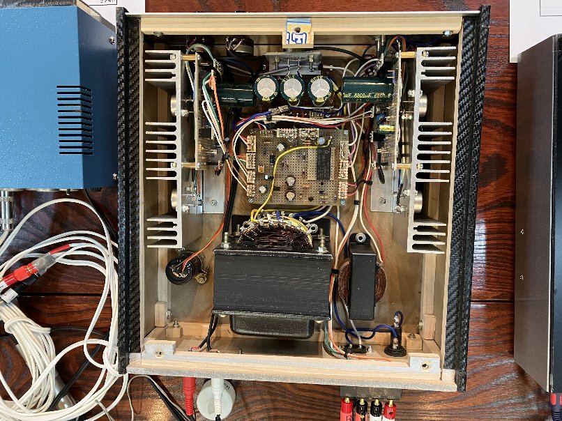 SONYが発売した3極管の特性を持ったVerticalFETを昔手に入れたのでそれを使用。 初段は2N3954、ドライバ段は2SA607を使っている。バイアス電流自動調整回路を使用。 電源投入時にノイズが出るので、タイムリレーを使ってノイズが出ないようにしている。 ヒートシンクは大きな物をノコギリで2つに分割して使っている。 トランジスタ用のトランスは安価で手に入る。シャシーも安価な素材を使用した。