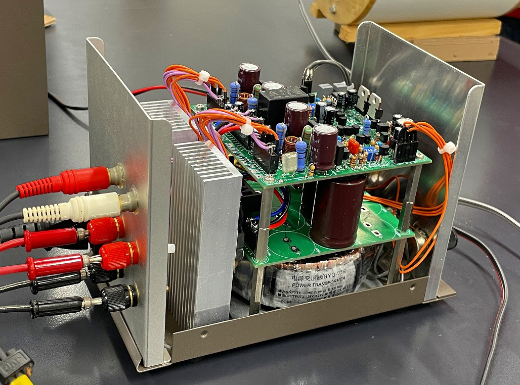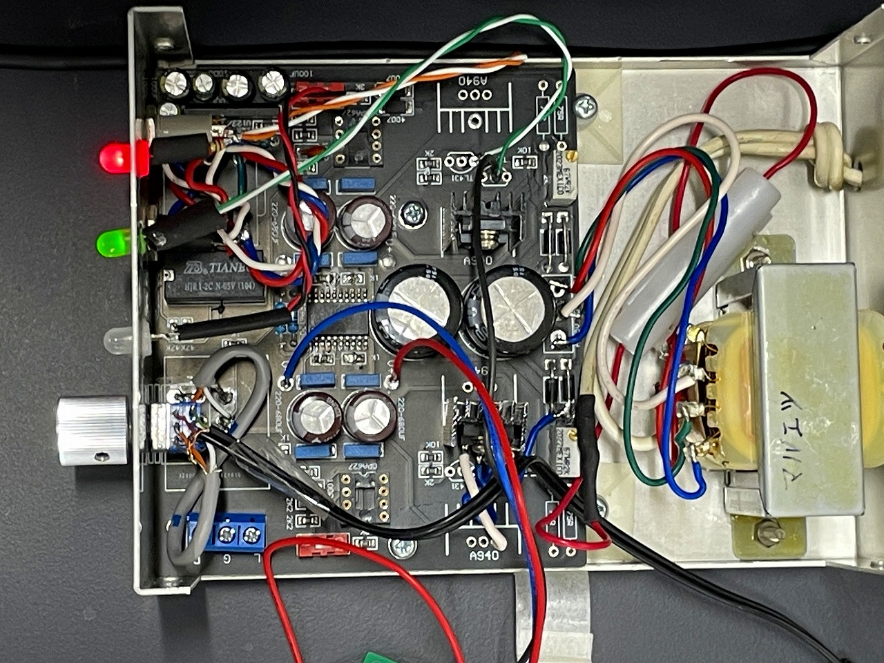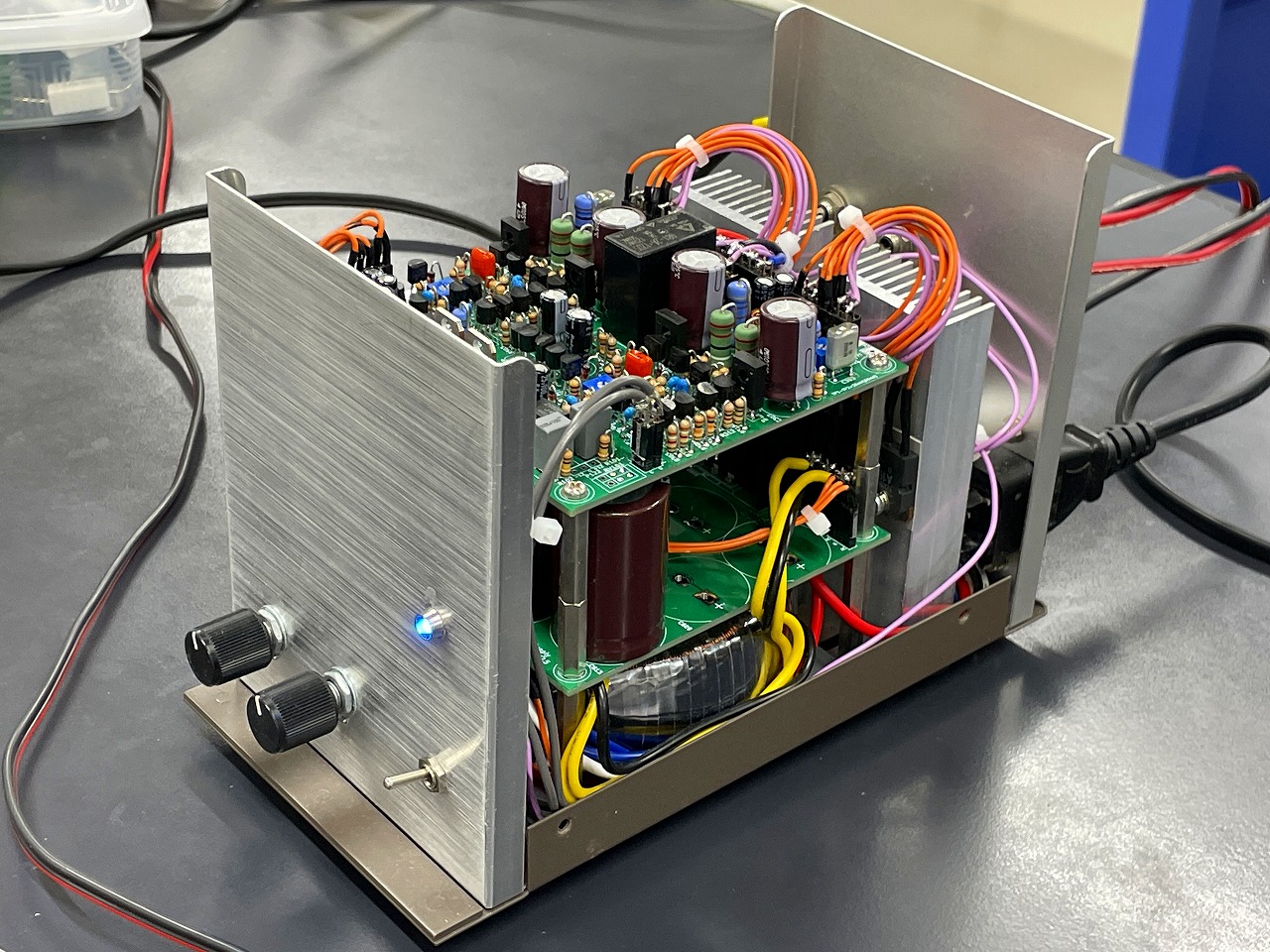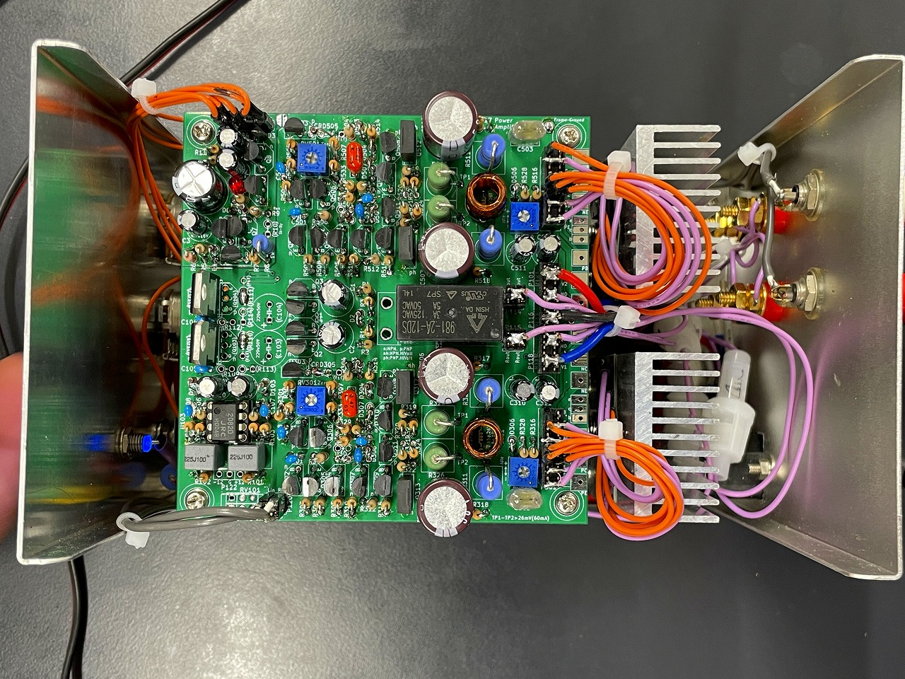 更に小型になった改良版アンプ。放熱器も小型になったのでバイアス電流も抑えてあるが結構発熱している。