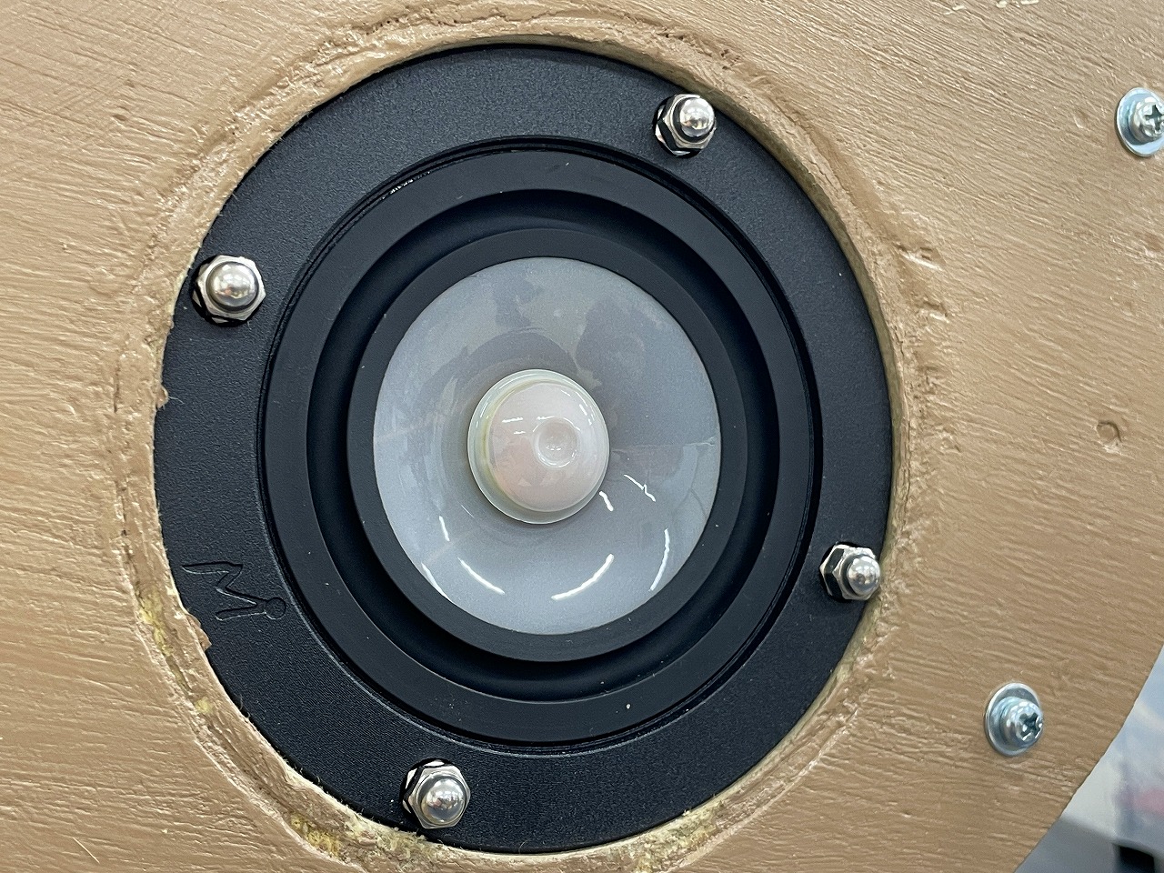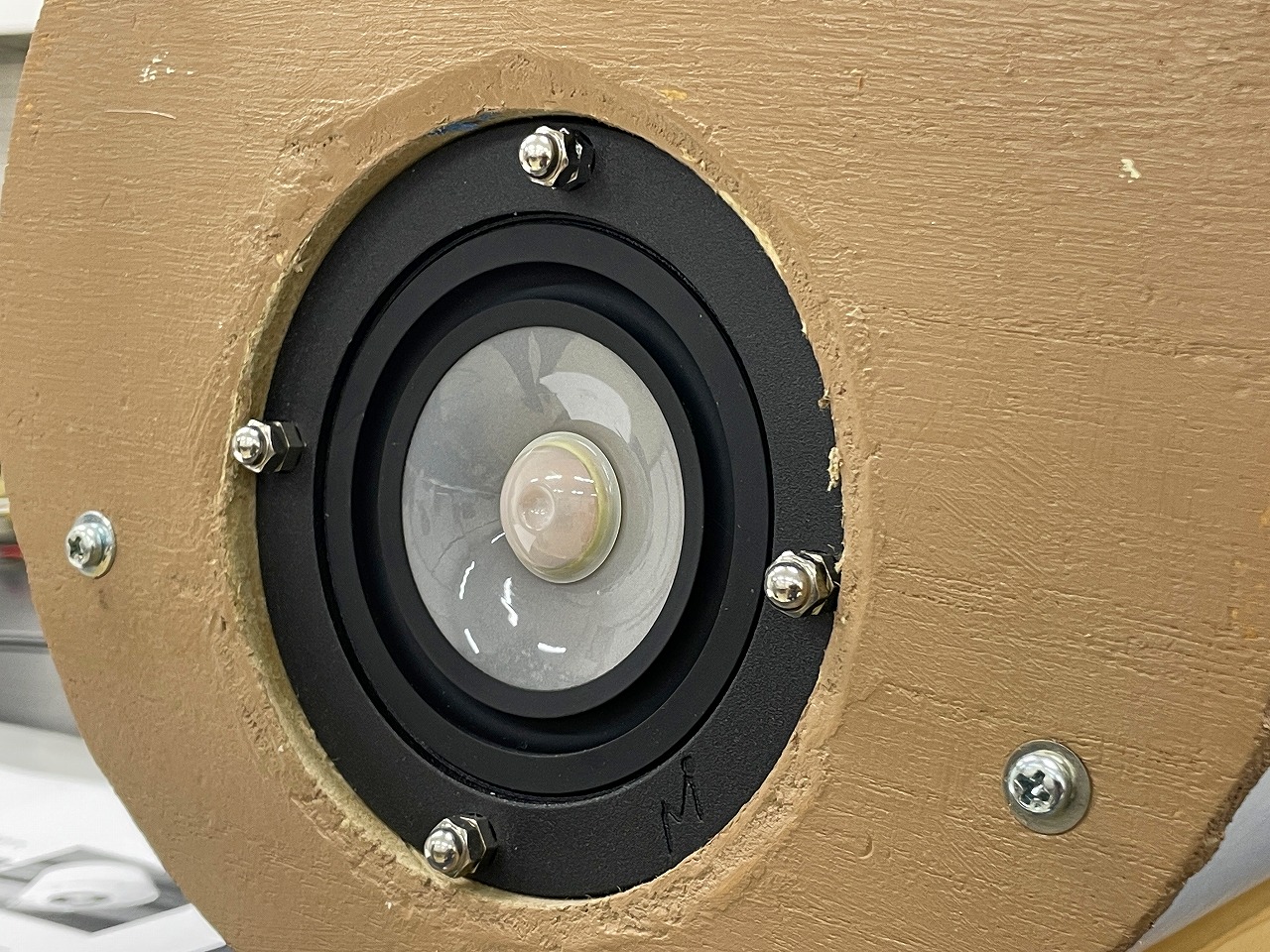 頭初の案ではウーファ上面の反射とミッドの干渉で特性が乱れたので、ミッドの向きを90度変更したとのこと。ウーファとのクロス周波数は少し低過ぎるかも。