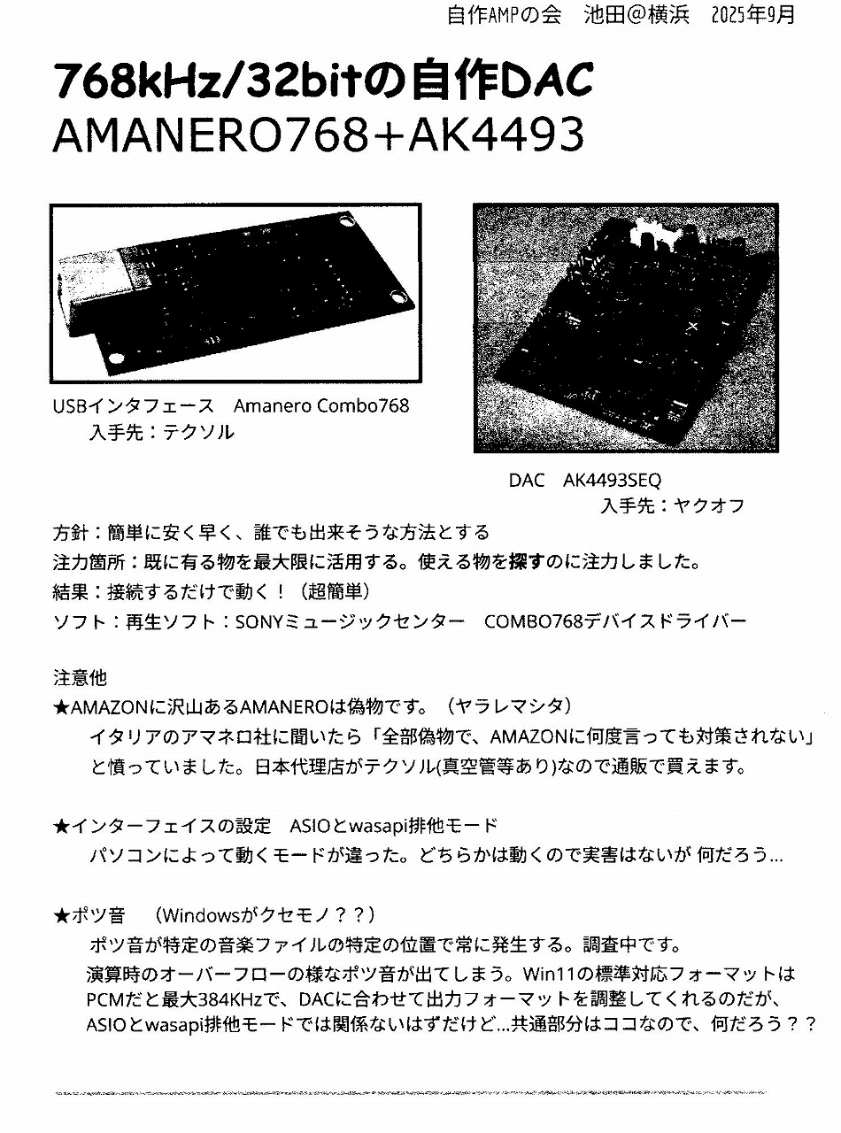 市販の基板を上手く組み合わせてハイサンプリングソースを聞かせて頂いた。DACチップの高性能化で768fsも再生できるようだ。