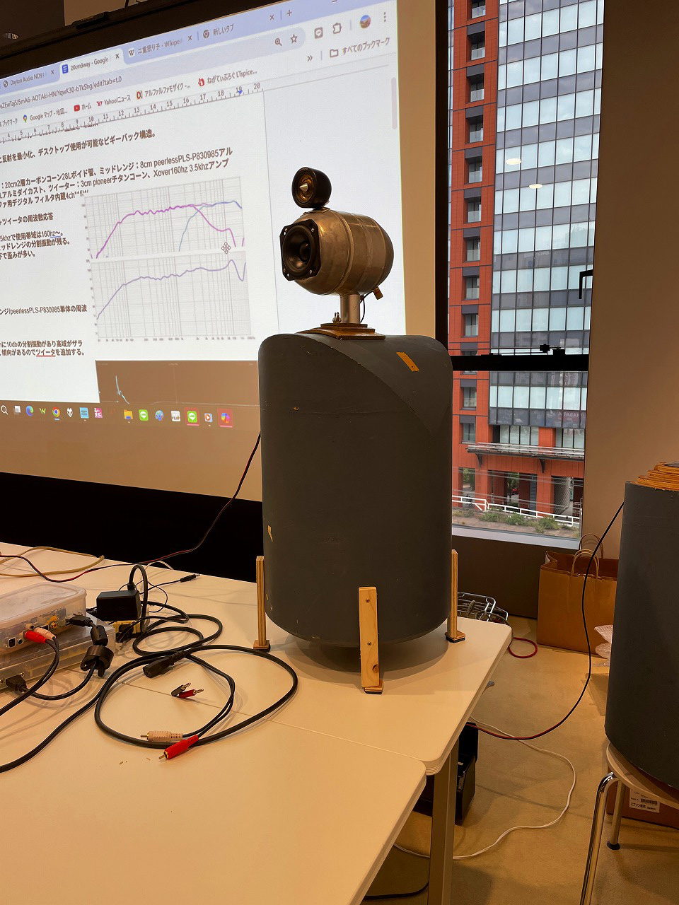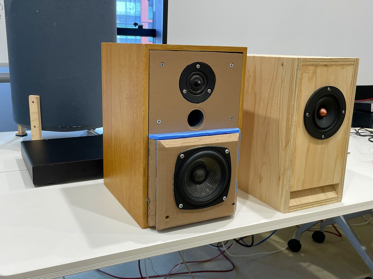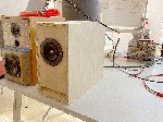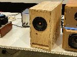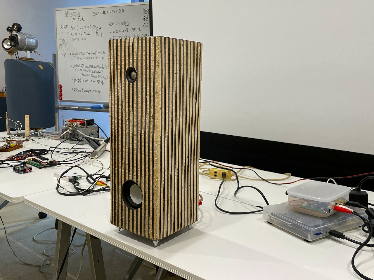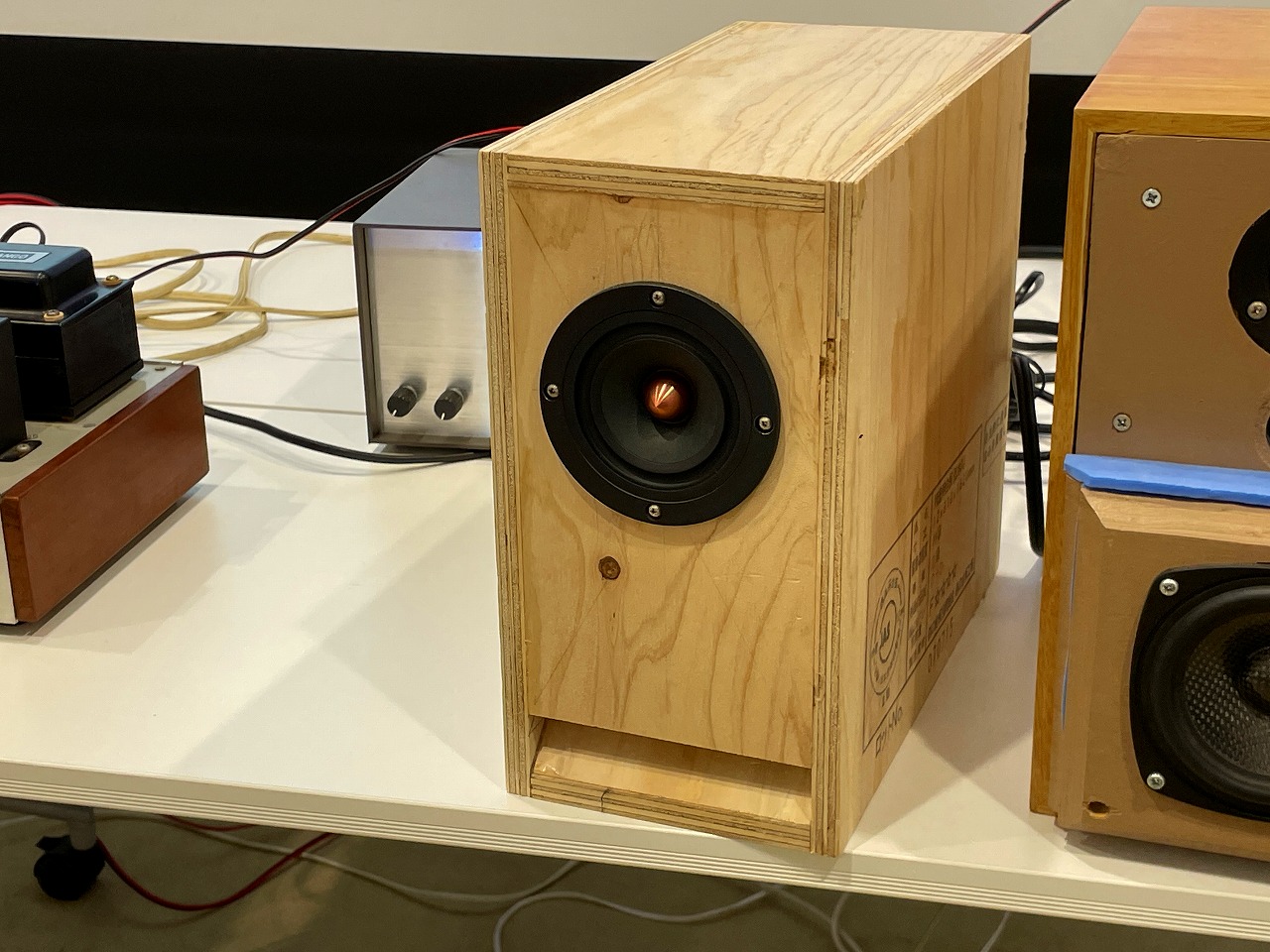 早くも冬のお寺大会課題のパワードライブ試作例のスピーカ。スタンダードに片側のスピーカにステレオアンプ基板(電源付き)を内蔵してもう一方はスピーカケーブル接続で駆動しています。 |