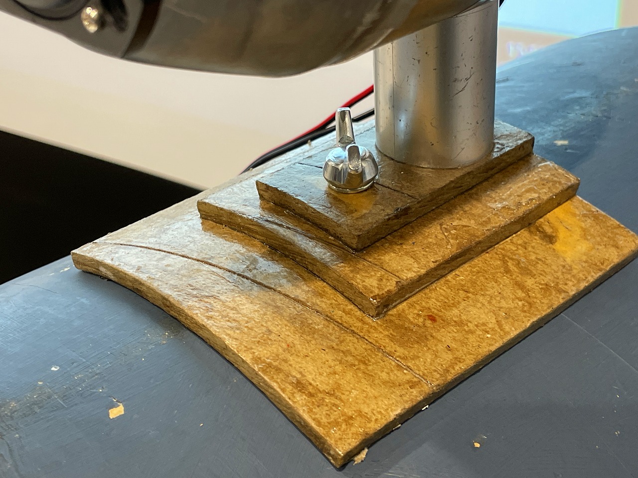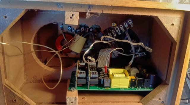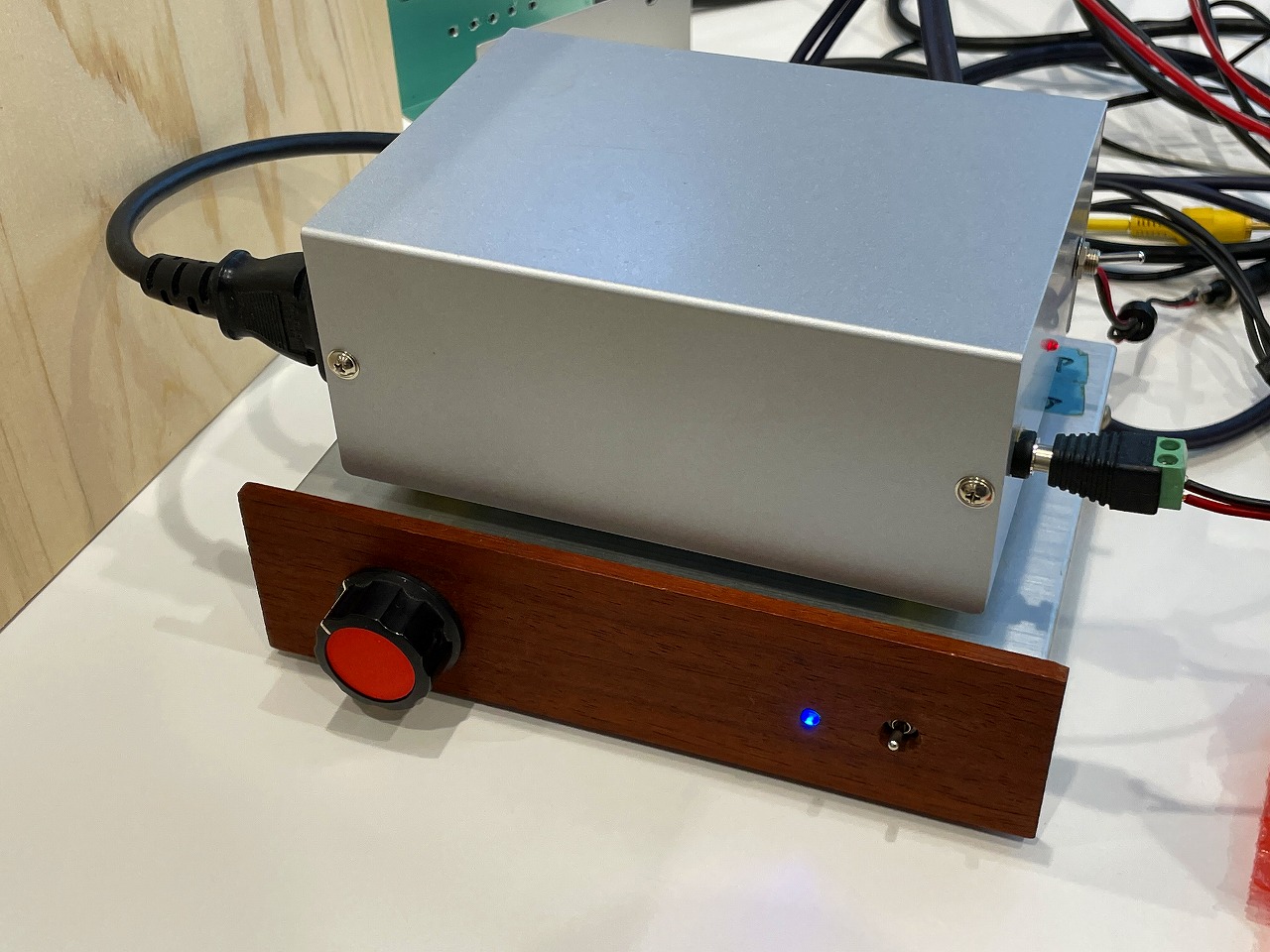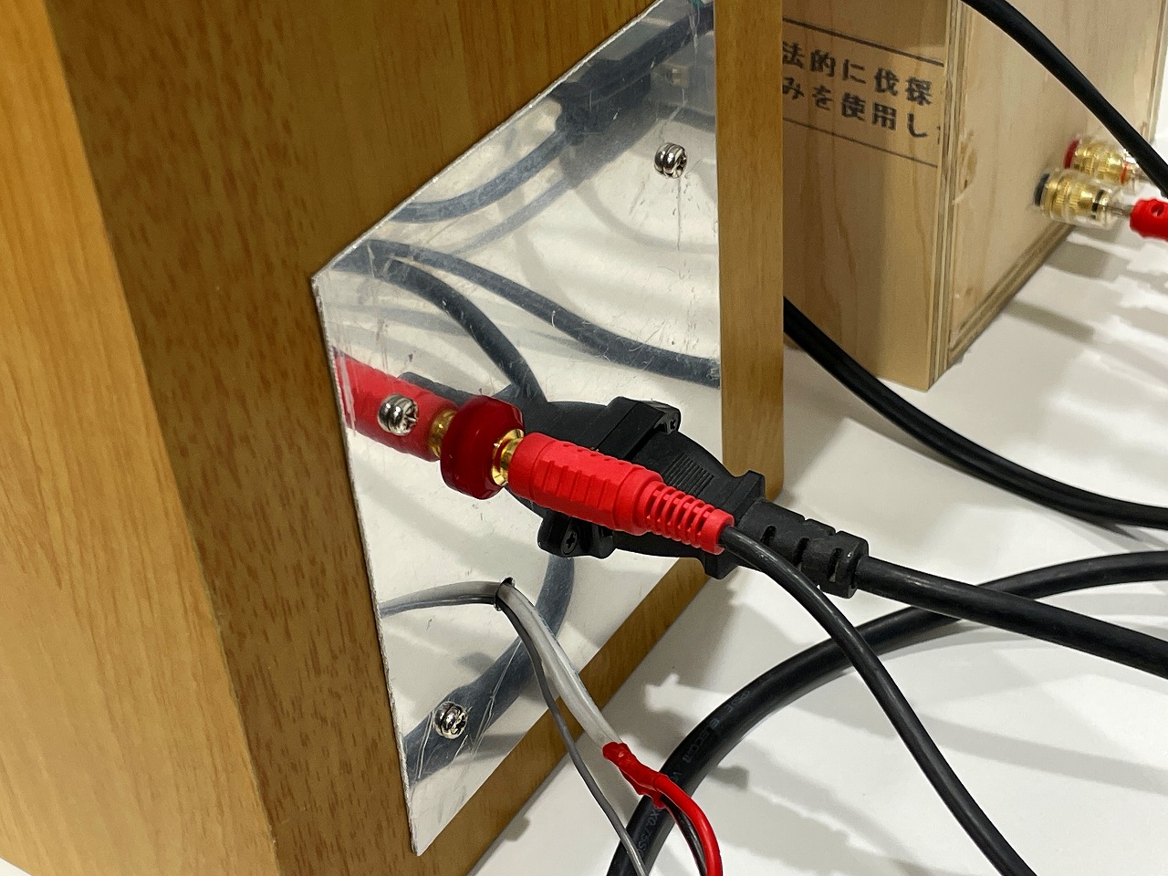 早くも冬のお寺大会課題のパワードライブ試作例のスピーカ。スタンダードに片側のスピーカにステレオアンプ基板(電源付き)を内蔵してもう一方はスピーカケーブル接続で駆動しています。 |