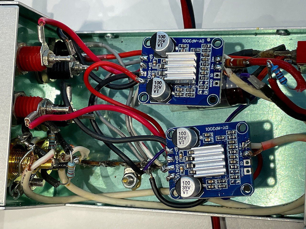出品者のコメント: アンプボードに使われているものはAP3015Dです。単価は345円です。 今回紹介したものは、接続図等の等の説明文が中国語でした。 今回の視聴に使用した電源はトランスから整流して定電圧化したもので17vです。 最大供給電圧が24v30w(多分4Ω) 最低動作電圧が8vとなっています。 このアンプボードはパワードスピーカー製作には役立つと思って視聴するために持参しました。 @DC電源で動作する。A小型である。B質感も良い方。C安い!という条件を満たしています。 以上、貴重な機会を頂きましたことを感謝します。 |
