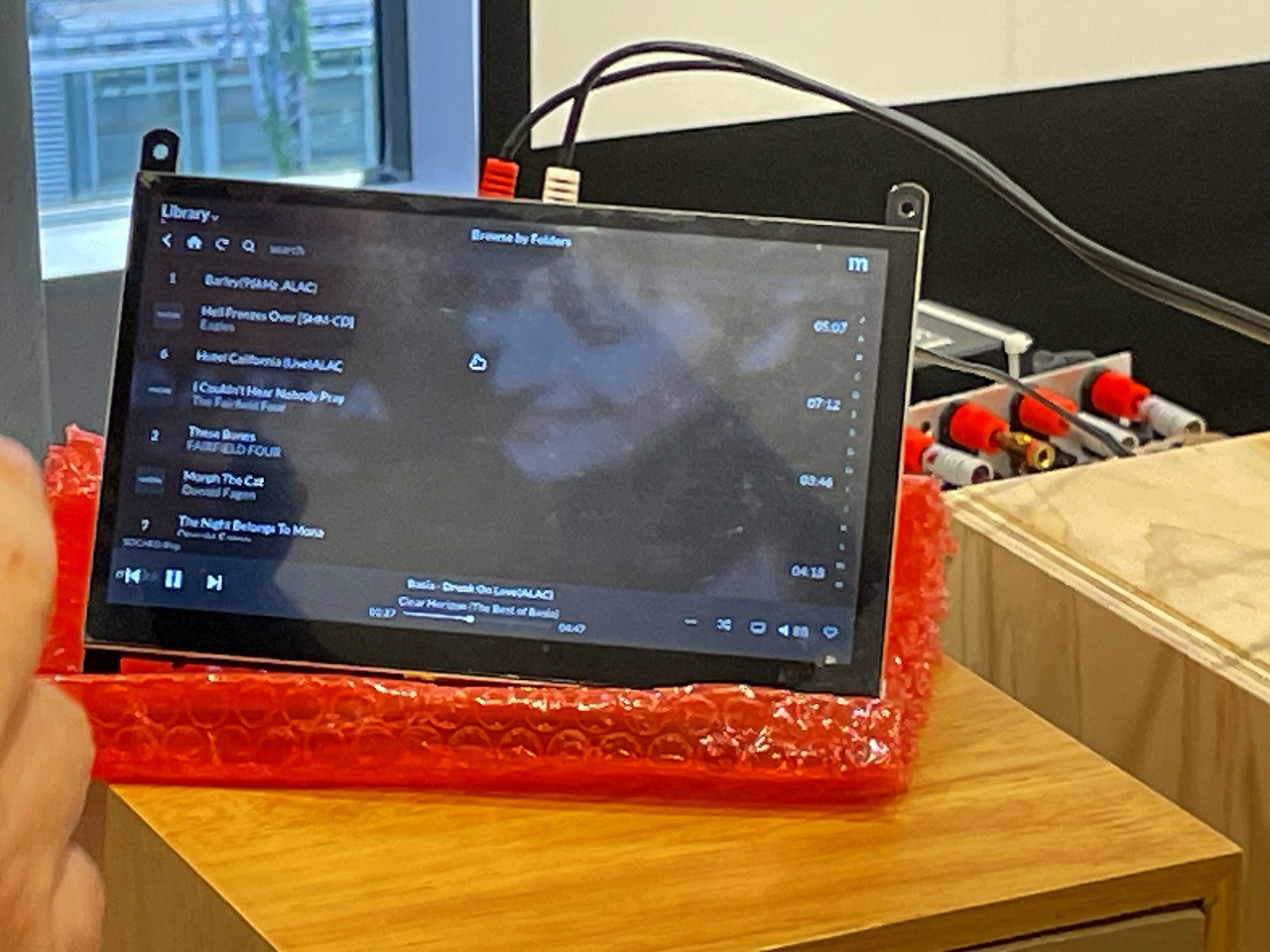 超小型のデジタルアンプですが、見かけによらずかなりのパワーがあって充分にスピーカをドライブしていました。発熱もそれほどではないようです。 |