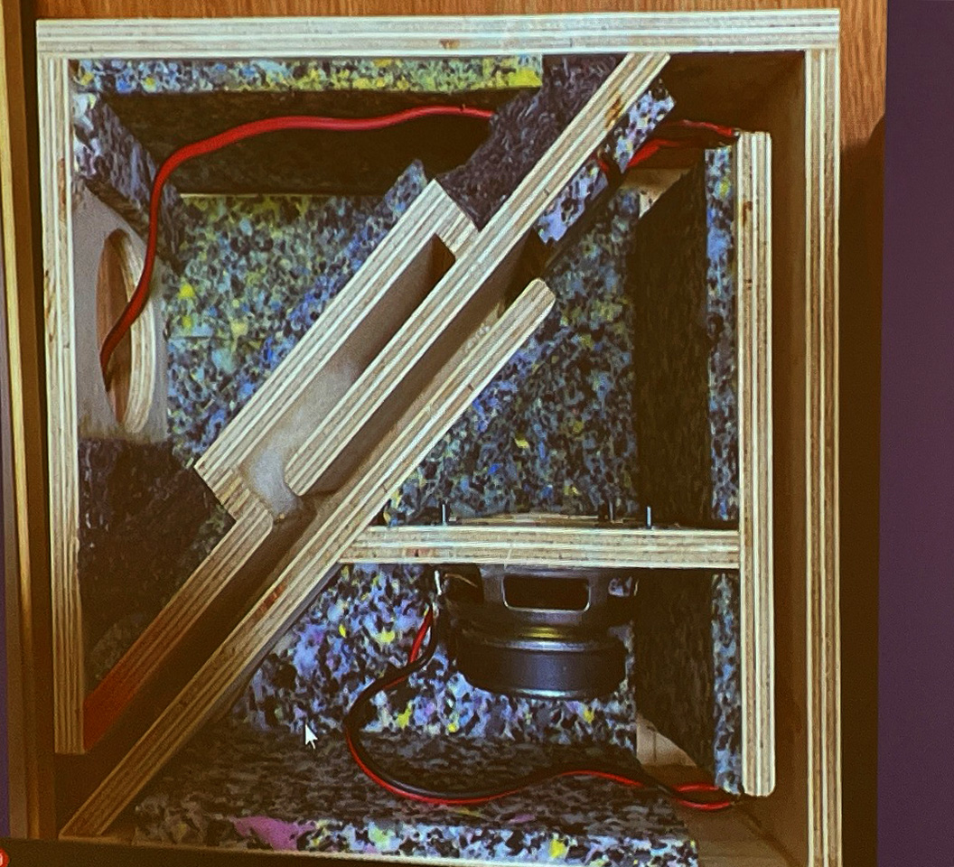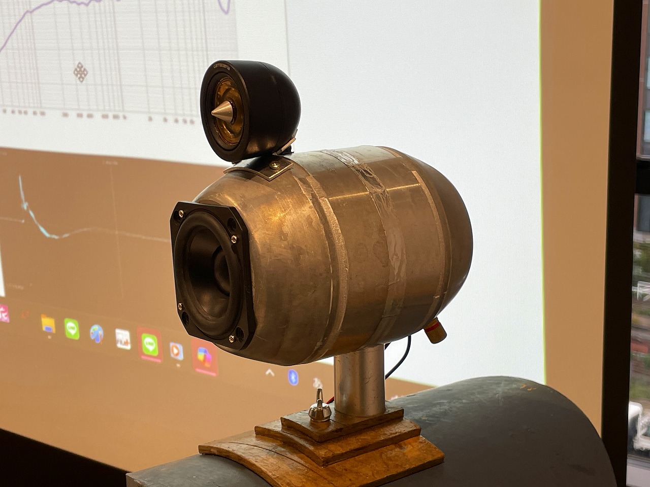 フルレンジシングルコーンスピーカと内部のケルトン式サブウーファの組み合わせによる2Wayスピーカです。デバイダと特性補償をDSPを用いて行っている本格派で、仕上がり特性は小型スピーカサイズとは思えないワイドレンジで特性的にも優秀な仕上がりでした。