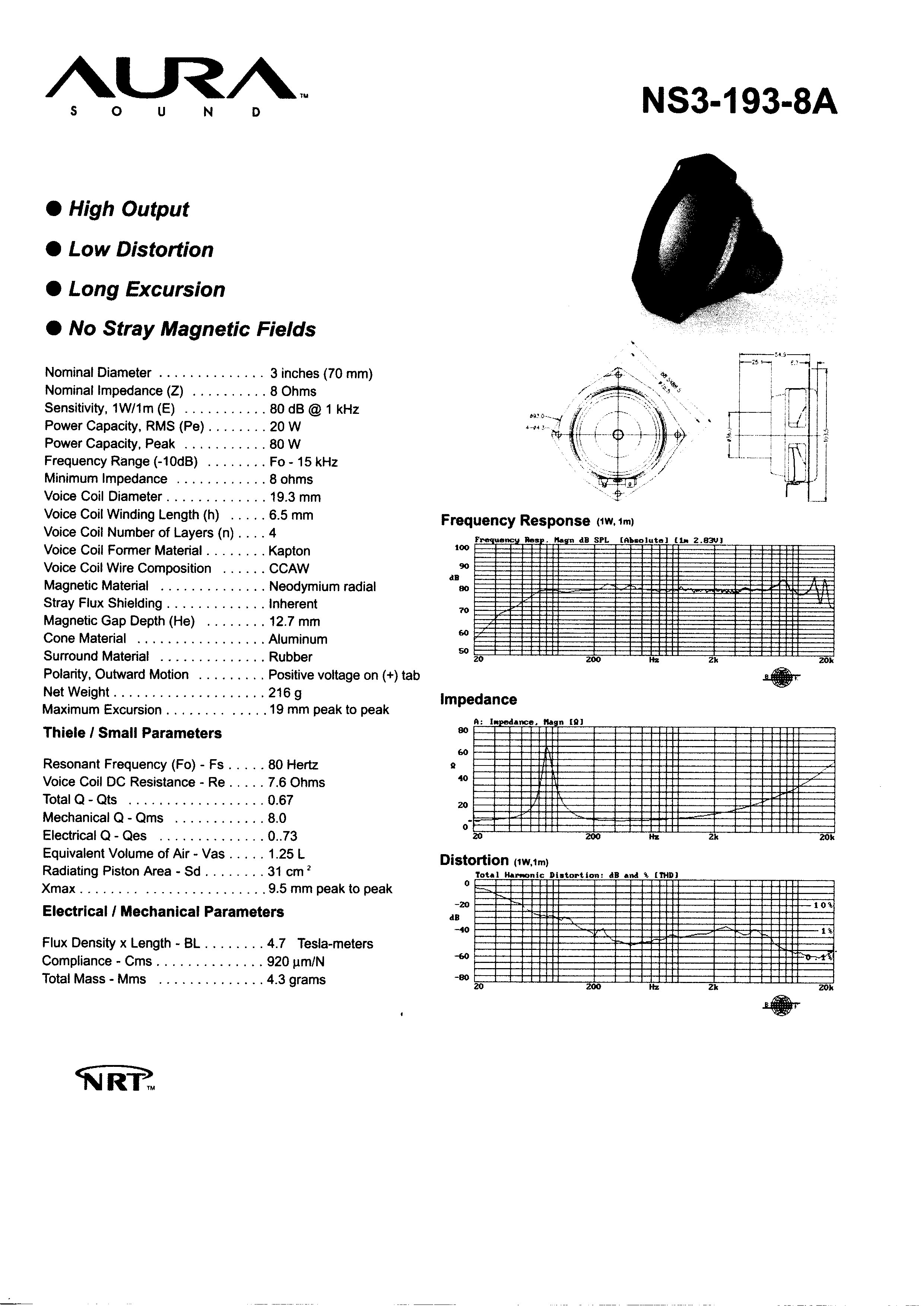 出品者のコメント: 70φの小口径の中低域ドライバー(NS3-193-8A)ですが、Xmax:9.5mm P.P.の効果が得られていると思います。 しかし、大入力の時の歪は、Xmaxの60%辺りから聴くに耐えられなくなります。 陶器のキャビネットは、金属の様な振る舞いをしますので、デッドニングが必須です。 |