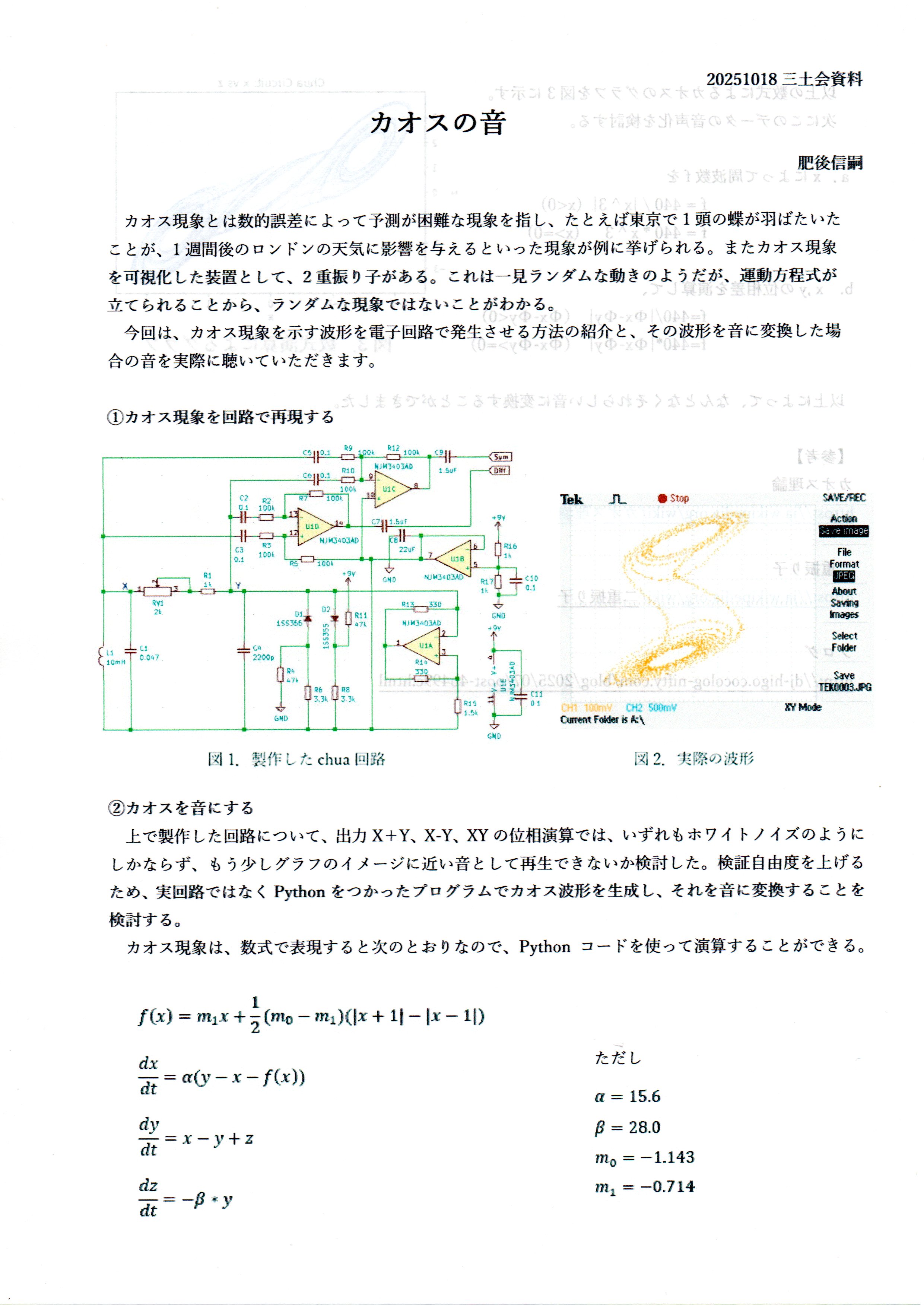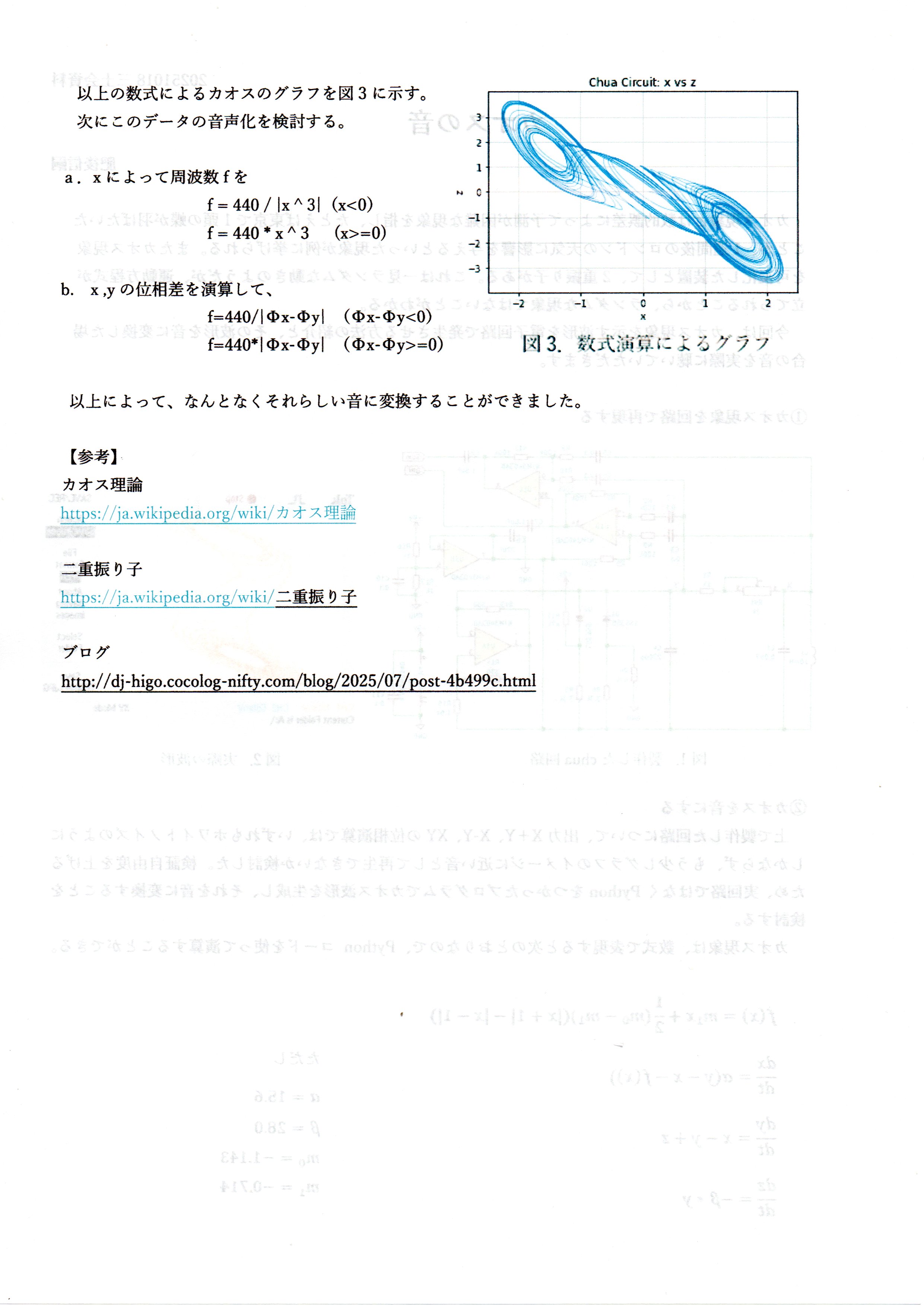 カオス現象に注目して、これを音表現できないかというアプローチが面白い。実際に例を聞いてみると一つの環境音楽?にはなるかもしれないですね。今回はプログラムだが回路レベルで実現できると使えるかもしれません。