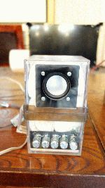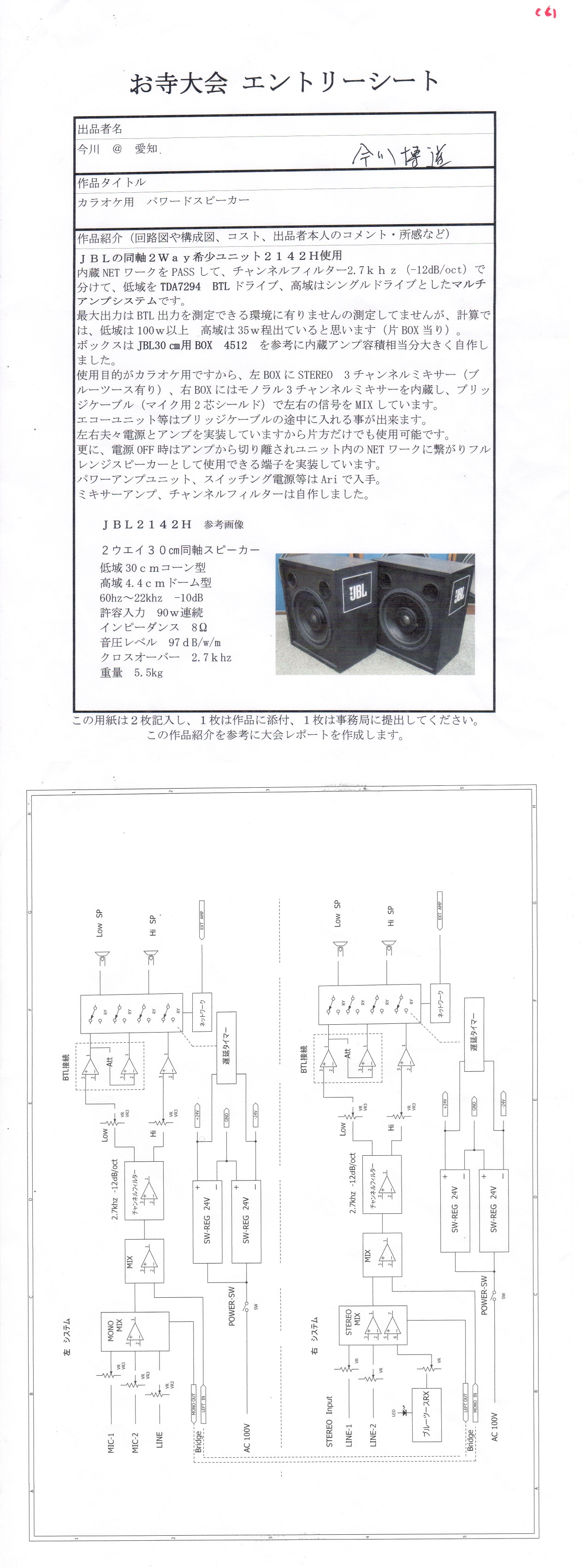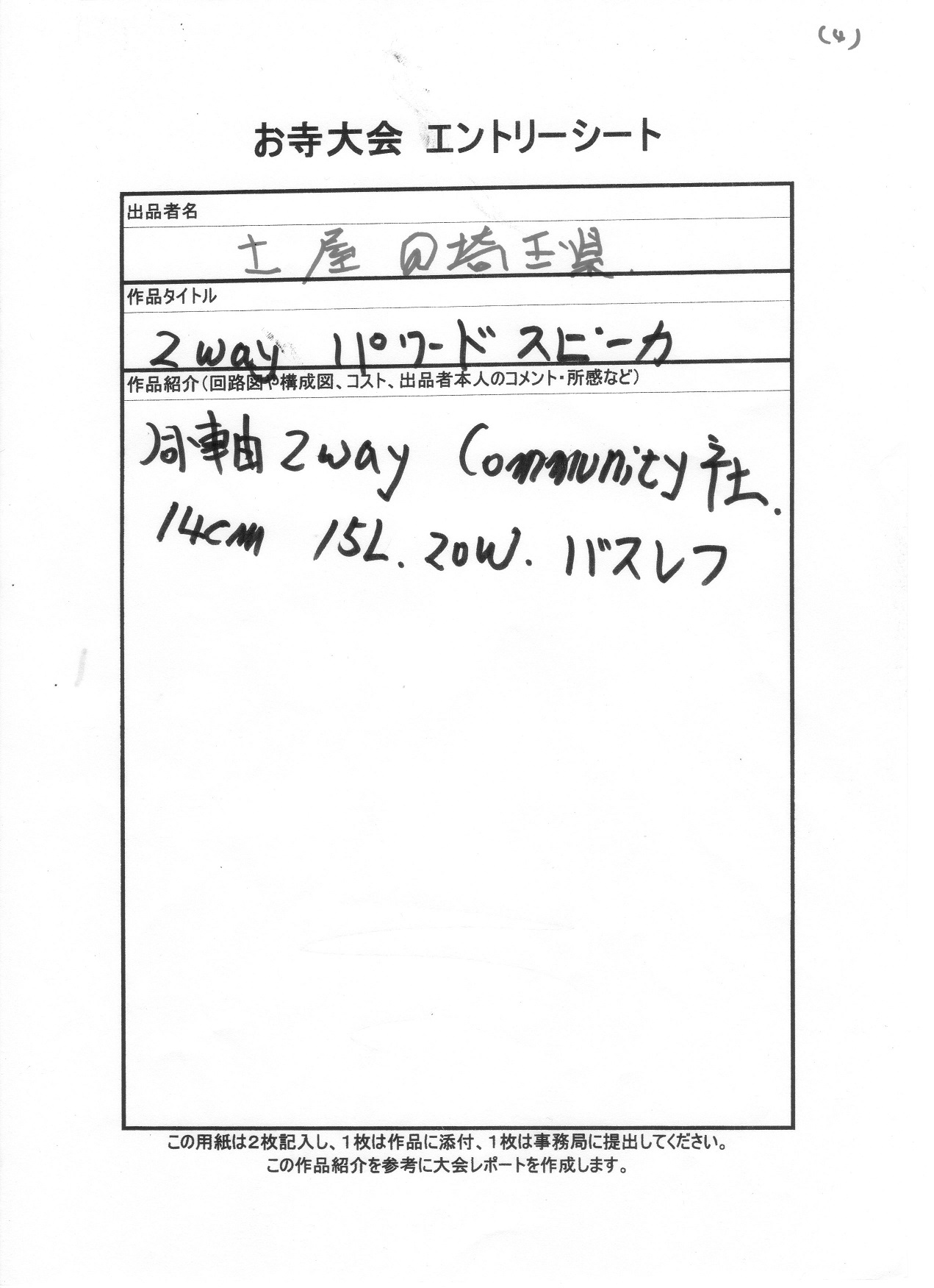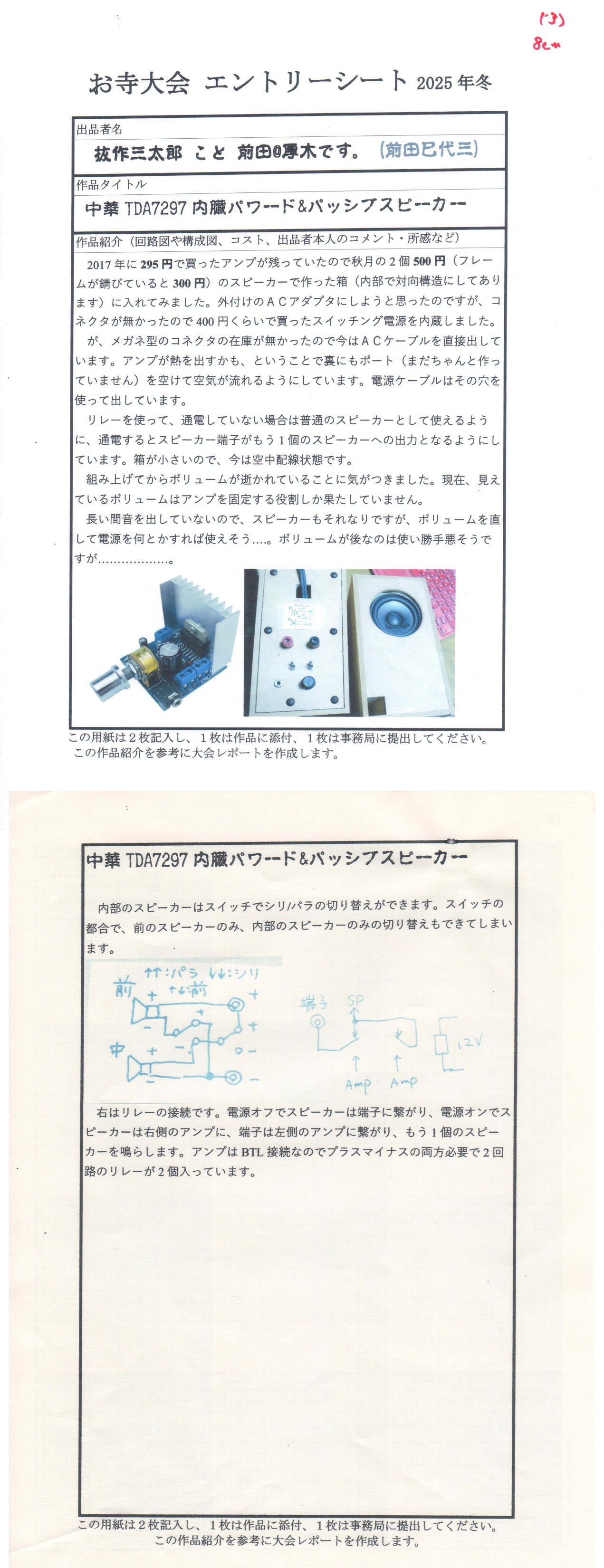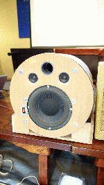 写真では見えにくいですが天井埋め込み用途の同軸2wayで中高域は素敵な音がしました、過制動で低域が出ないので大きなバスレフポートを付け何とか聞ける音にまとまったかと思います。