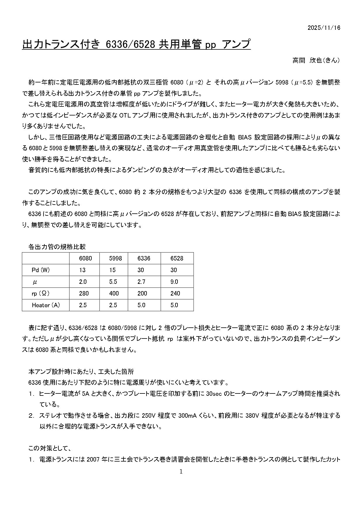 6336/6528 単球 P.P.アンプ 高間 さん