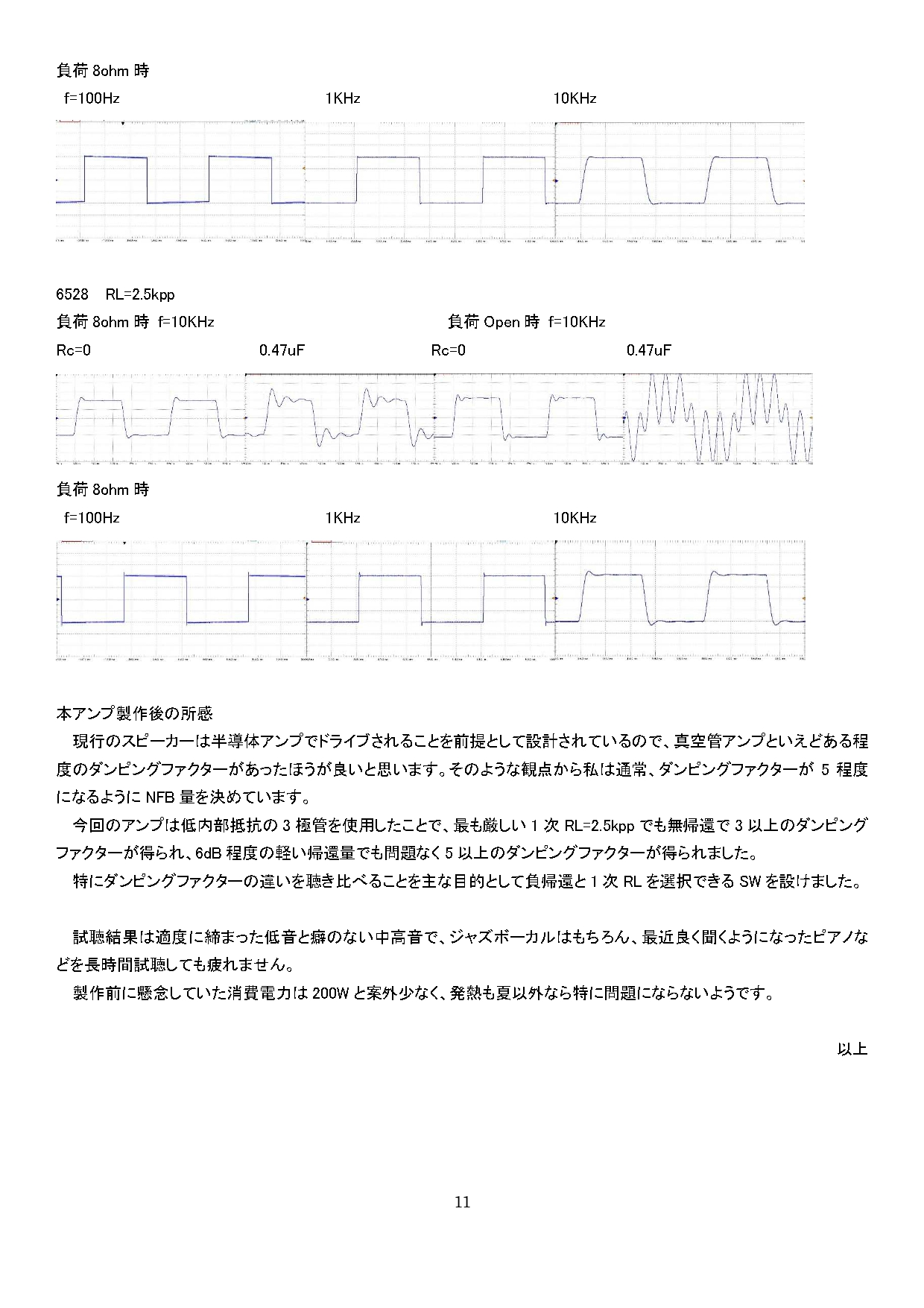 今回のアンプは電源に自作のトランスを使用したり、比較的高価な大型出力トランスを使用するなど一般的には製作し難いアンプとなってしまいましたが、次回は入手が簡単な部品で製作できる小型アンプ(6BX7pp 最大出力約7W)の製作を考えていますので、興味のある方は是非ご期待ください。