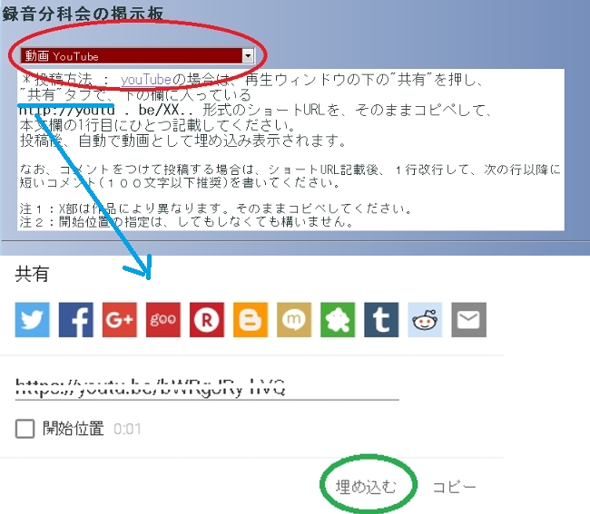 緑枠の「埋め込み」URLをそのままコーピーすれば動画はアップ出来る様です投稿時 動画がアップ出来ない事を言ってもわらないと趣旨が判らない投稿に見えてしまいます管理する側も 仕事ではなく有志による趣味仲間の集まりです他意や悪意もありませんのでお手柔らかに 御願いします