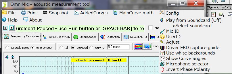 グラフ上の左側ラジオボタンは「sine sweep」を選びます。「pseude noise」も選べますが精度が落ちるので「sine sweep」を選んでください。測定は必ず片chづつ行います。(両ch同時だと左右の再生音の干渉が起こり特性が乱れて正確な測定が出来ません。)
