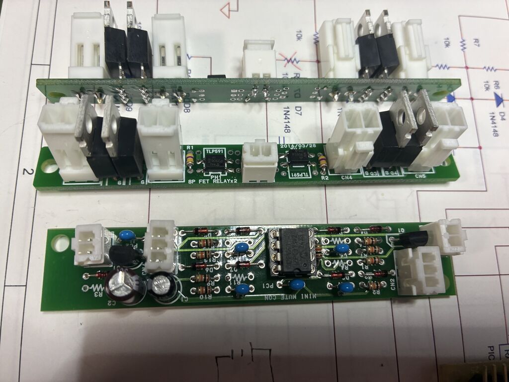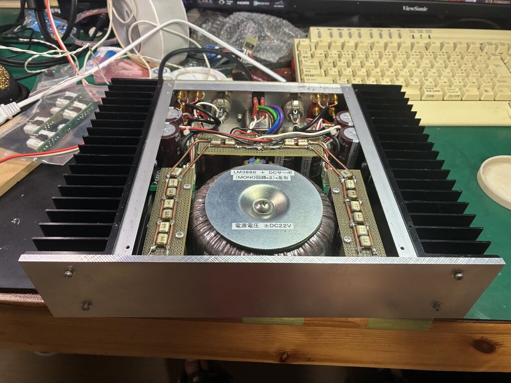 これも、2014年頃に、作成したものです。LM3886にDCサーボをかけたBTLアンプです。今回、先日開発した保護回路を入れました。電源投入時に2秒間のミュート、電源断時に即座に断、SP出力4系統のDCオフセットを監視し1V程度でたらミュートです。メカニカルリレーは、ON抵抗がメーカー公称値では、0.1Ωとかで、なおかつ経年劣化しますが、MOSFETでは、2個直列でも5ミリオーム程度ですので、ダンピングファクターに影響は少ないです。