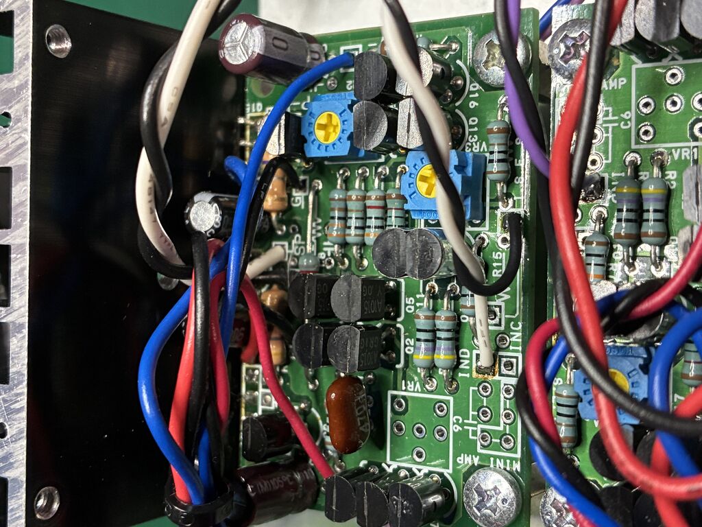 回路はできるだけ簡単にしました、何も足さない 何も引かない(笑)回路はまねてもパーツはまねられない(泣く)二段目差動TRコレクター(5mA)から終段TR(hFE100)ベースへダイレクト アイドリング電流0.5A hFEは温度によって変化するのでアイドリング暴走対策は放熱板に接着したC1815X2から一段目差動の電流を制限することで行っています。時空を超えられたかな?