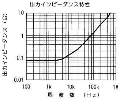 出力インピーダンス特性は電流注入法で測定し、DCから2k Hzまで0.08Ω、それより高域ではNFBが減るため上昇しますが60kHzで0.8Ωです。