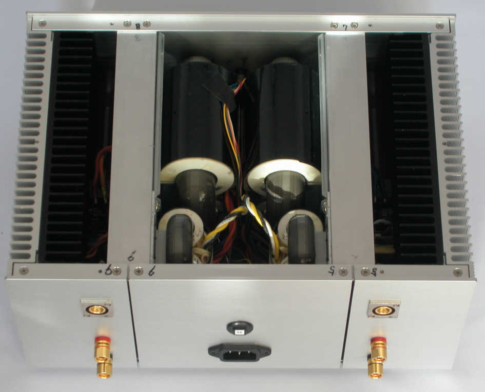 リアパネルを3分割、その両サイドをアンプブロックの載るヒートシンクと一体化して、入出力の配線を最適化して、電源トランスの載るセンターのブロック部分とは、