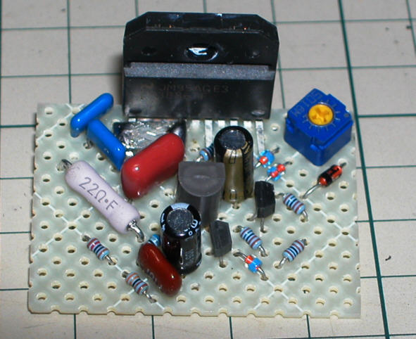 ユニバーサル基板を45°傾けるとLM3886のピンピッチと一致するため、このように無理なく基板に載せることができます。 |