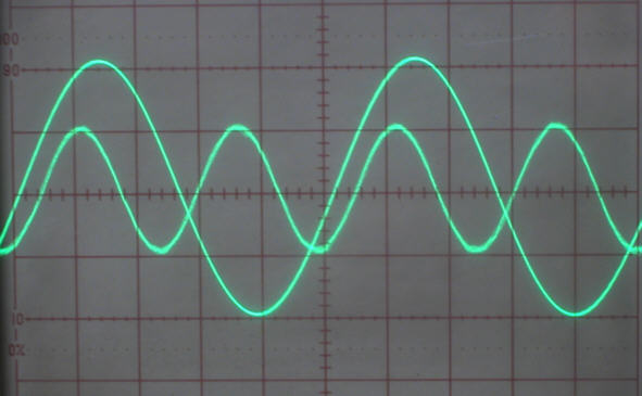 ご覧の通り、上側に伸びた2次高調波歪波形です。