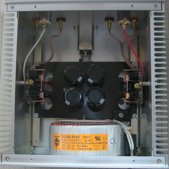 コの字に曲げたアルミ板の内側に整流ダイオードと電源トランスへの配線が収まる。