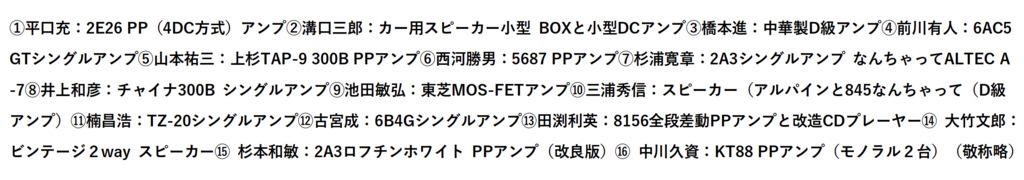 写真のアンプ、スピーカー製作者と出展された機器の簡単な説明を加えました。