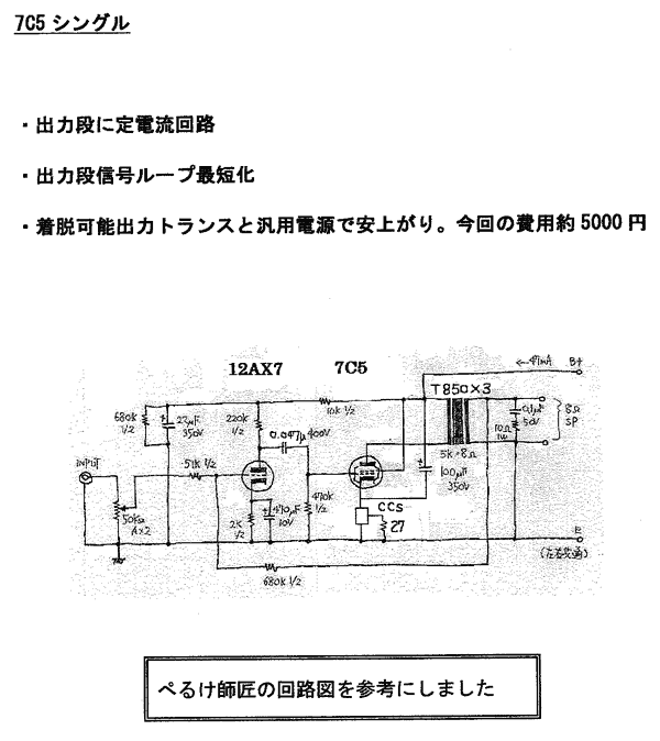 介川さん コッククロフト6V6アンプ。出力トランスにヒータートランスを使用。聞きやすい音 (説明資料) |
