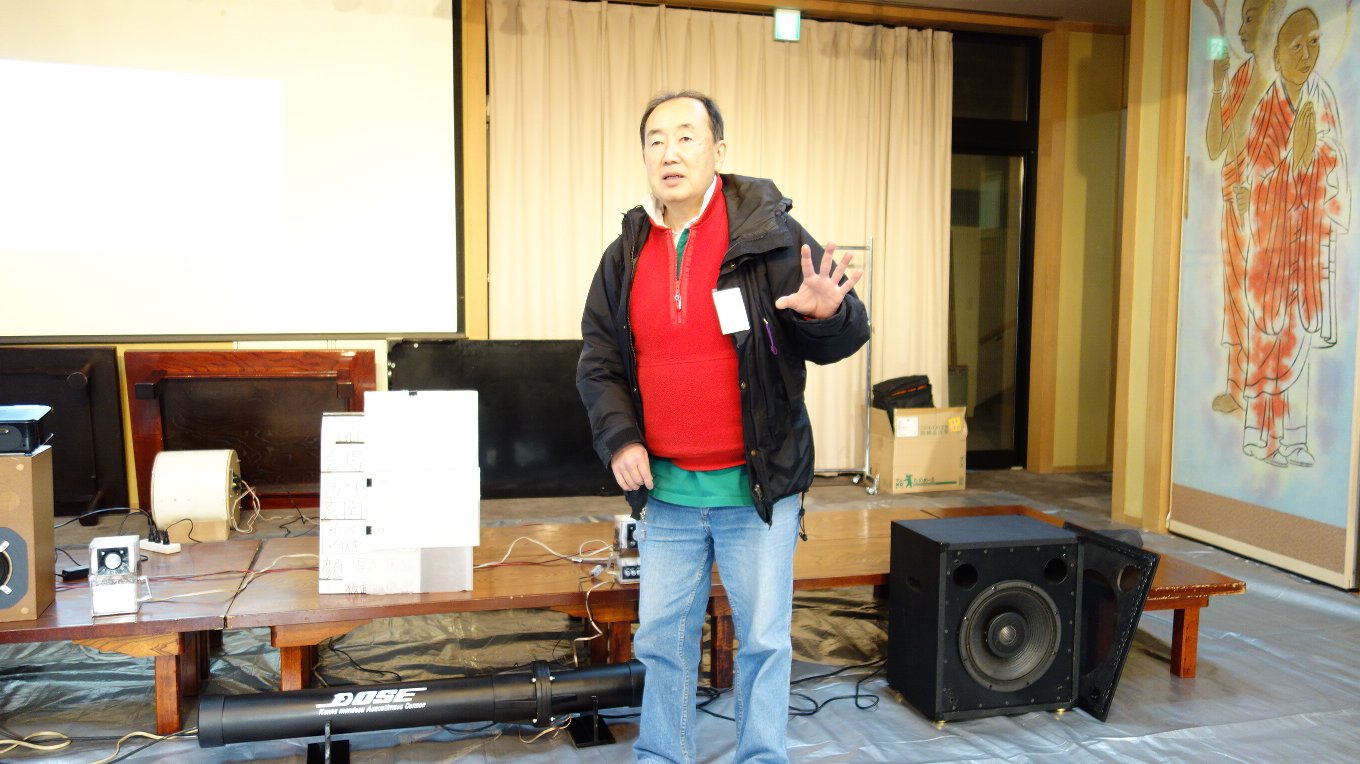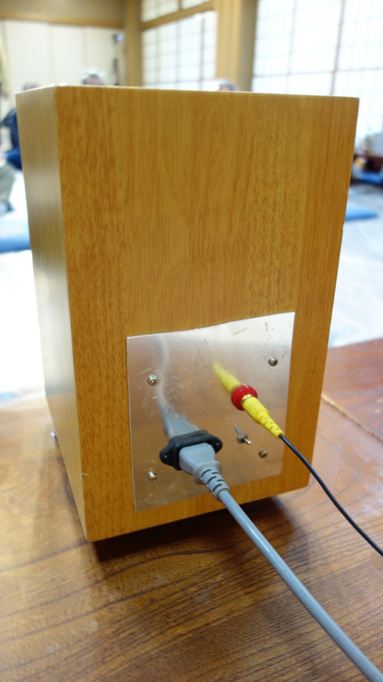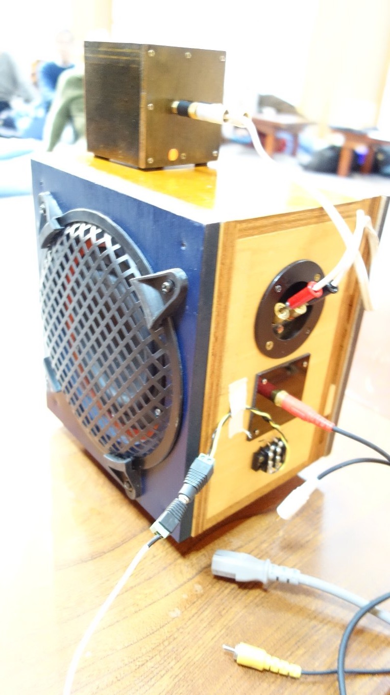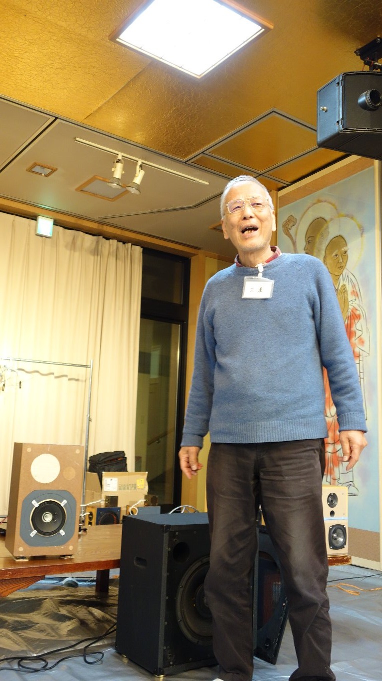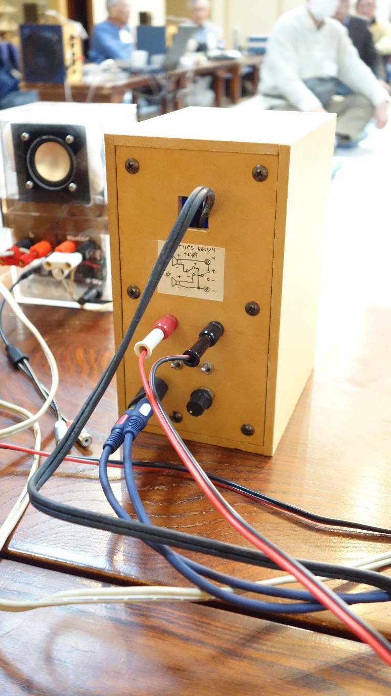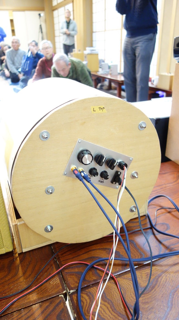 昨年のお寺大会に出品したスピーカーに、マルチアンプを組み込んだものです。昨年のものは低域と高域のつなぎが悪くてイマイチの音でしたが、マルチアンプにして位相や音量のバランスを調整したところ別物の音になり、本人もびっくりしました。