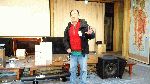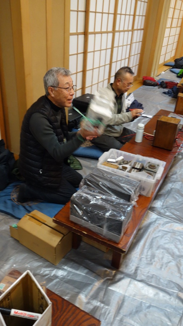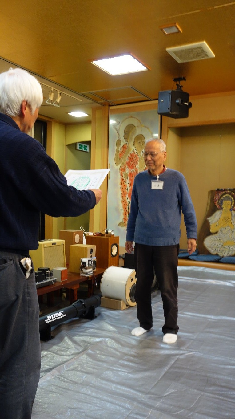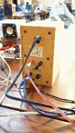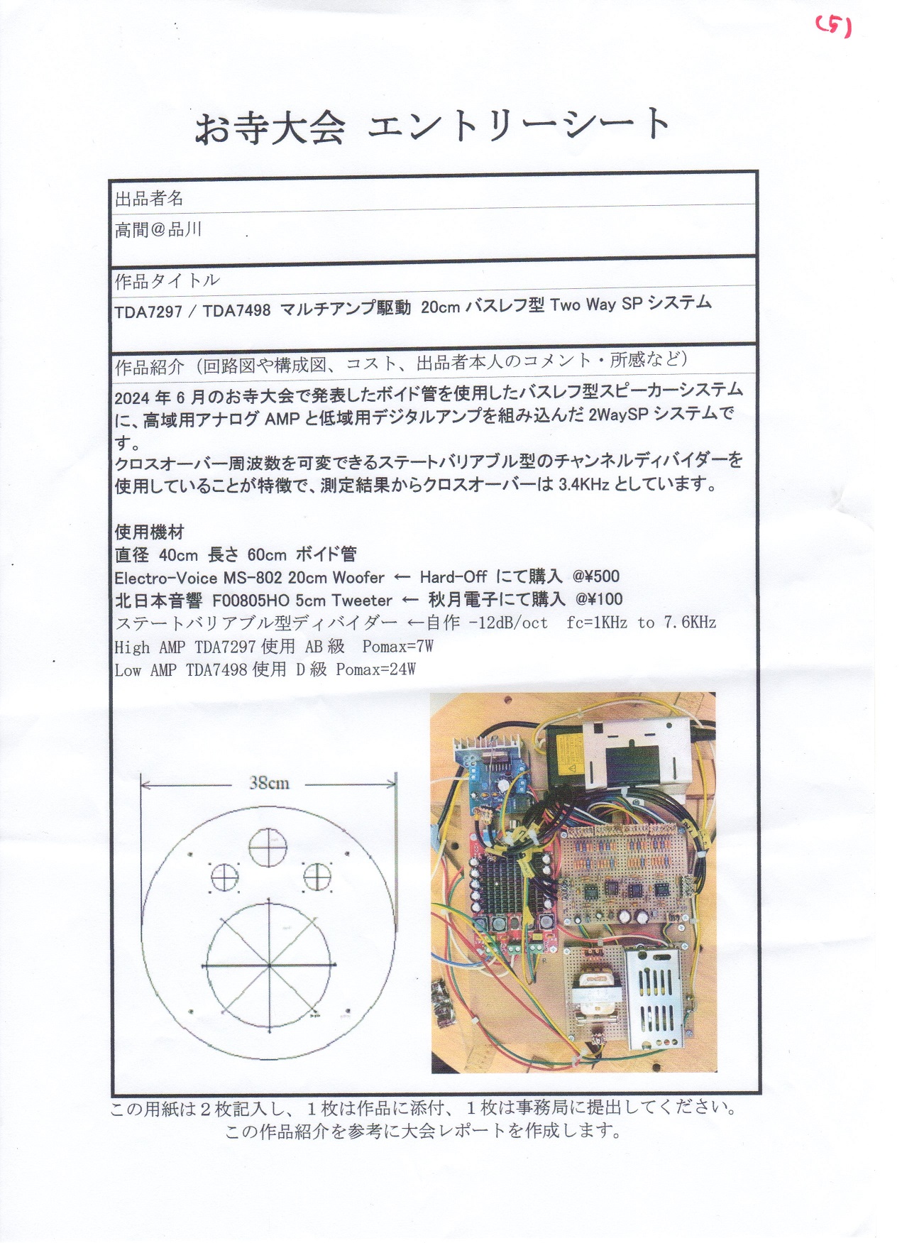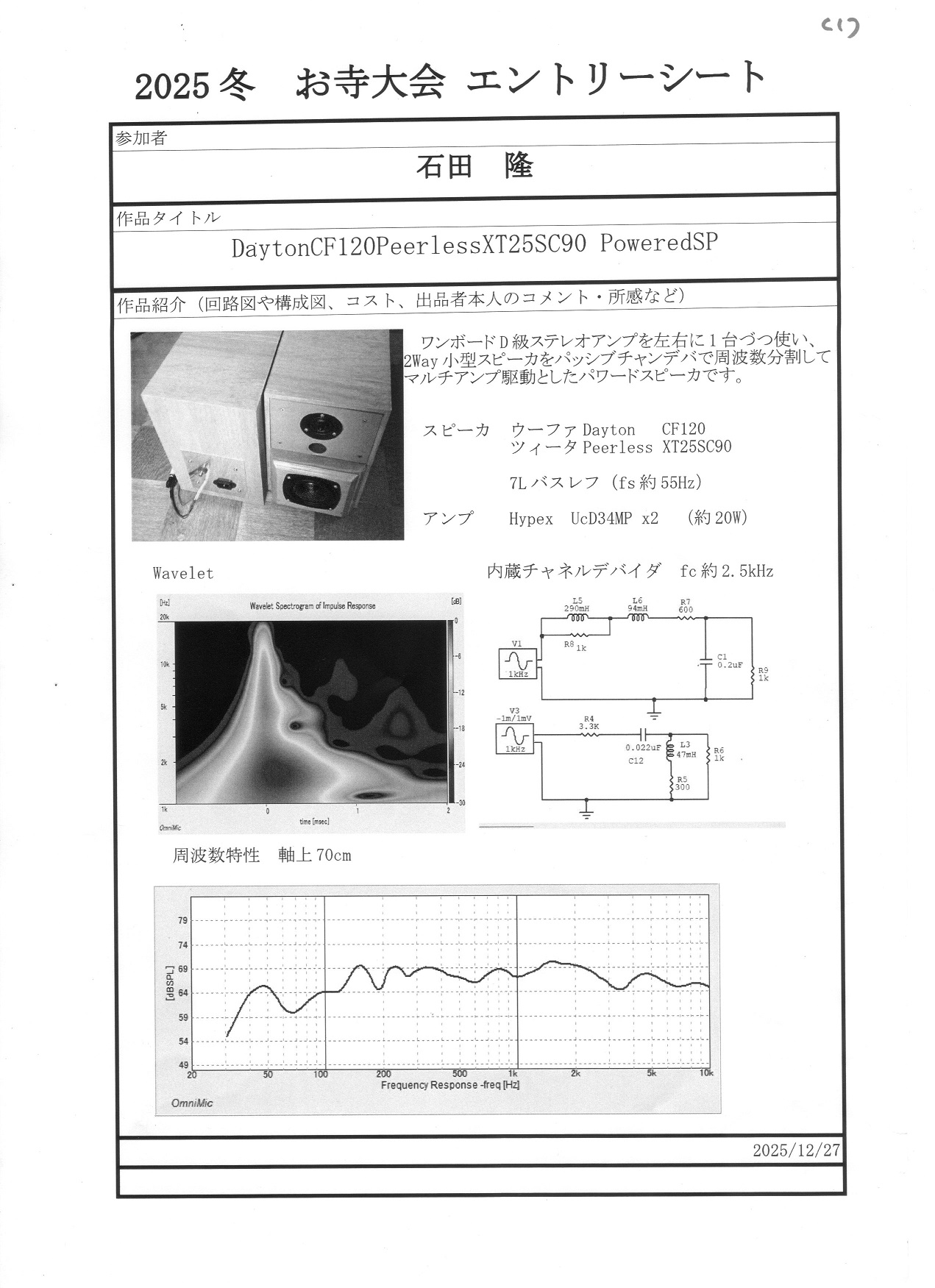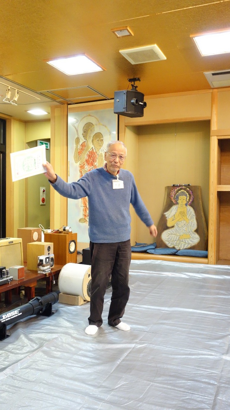 昨年のお寺大会に出品したスピーカーに、マルチアンプを組み込んだものです。昨年のものは低域と高域のつなぎが悪くてイマイチの音でしたが、マルチアンプにして位相や音量のバランスを調整したところ別物の音になり、本人もびっくりしました。