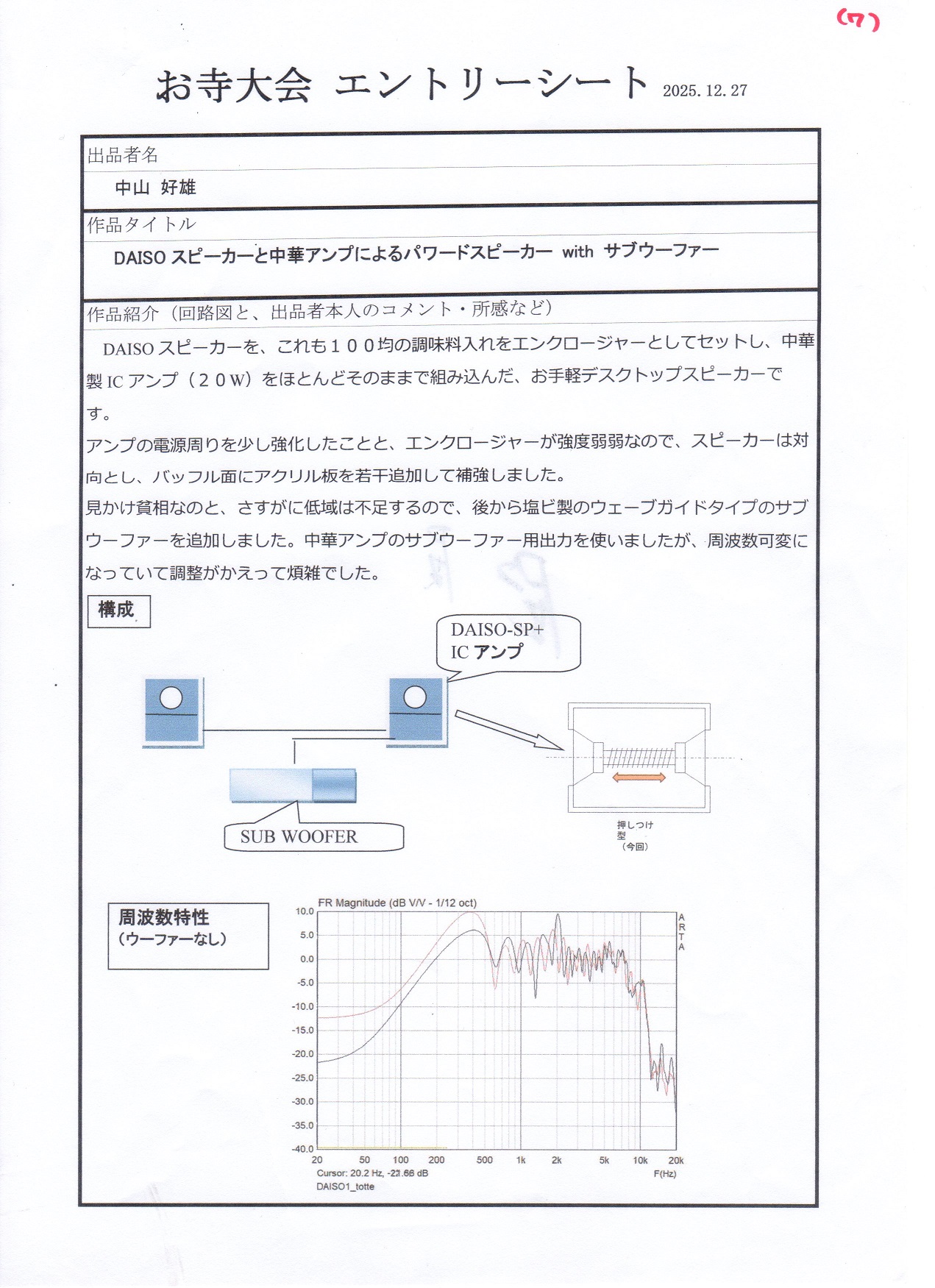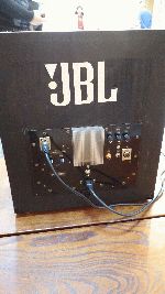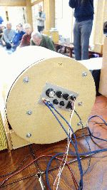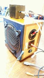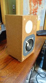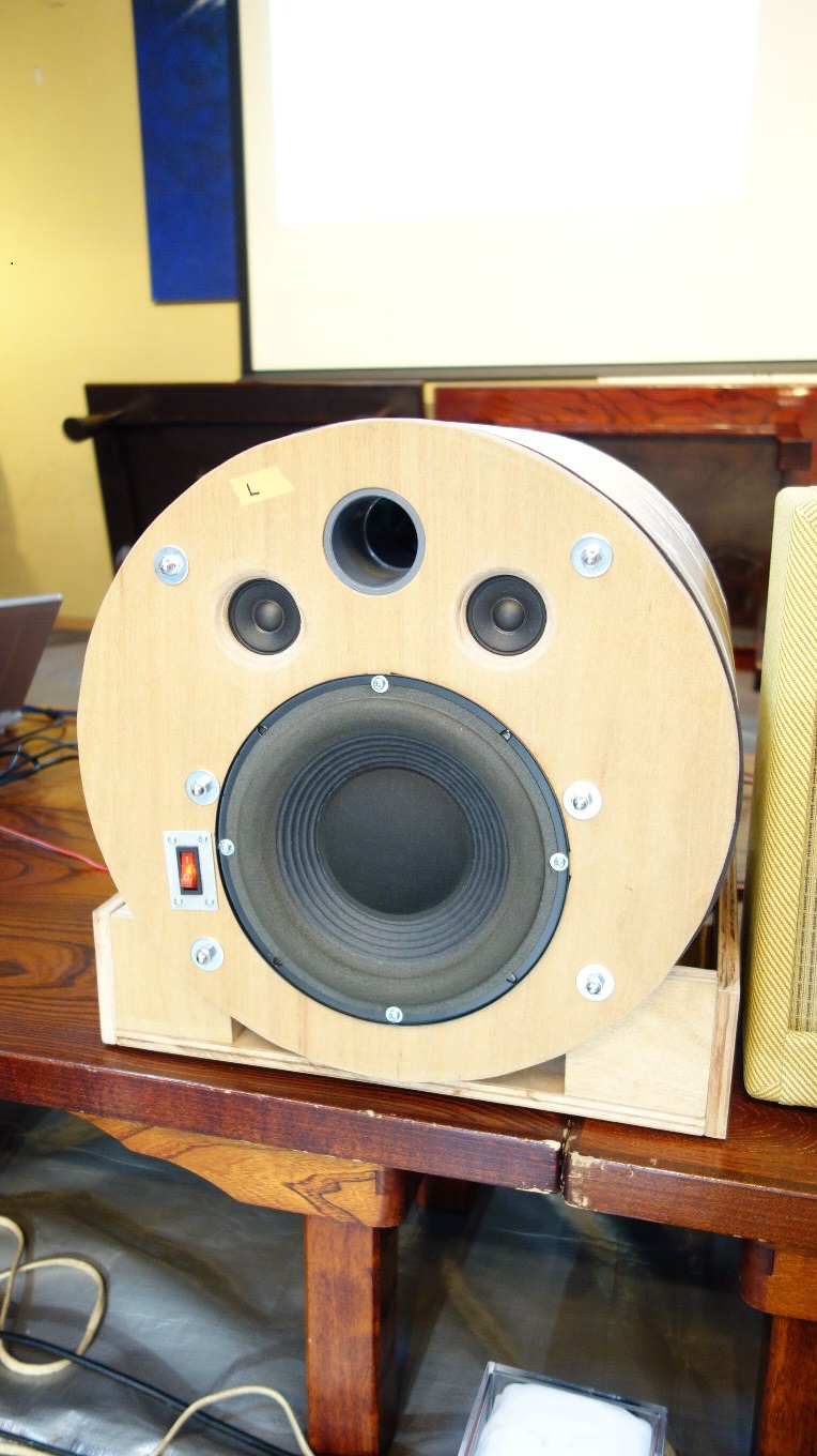 写真では見えにくいですが天井埋め込み用途の同軸2wayで中高域は素敵な音がしました、過制動で低域が出ないので大きなバスレフポートを付け何とか聞ける音にまとまったかと思います。